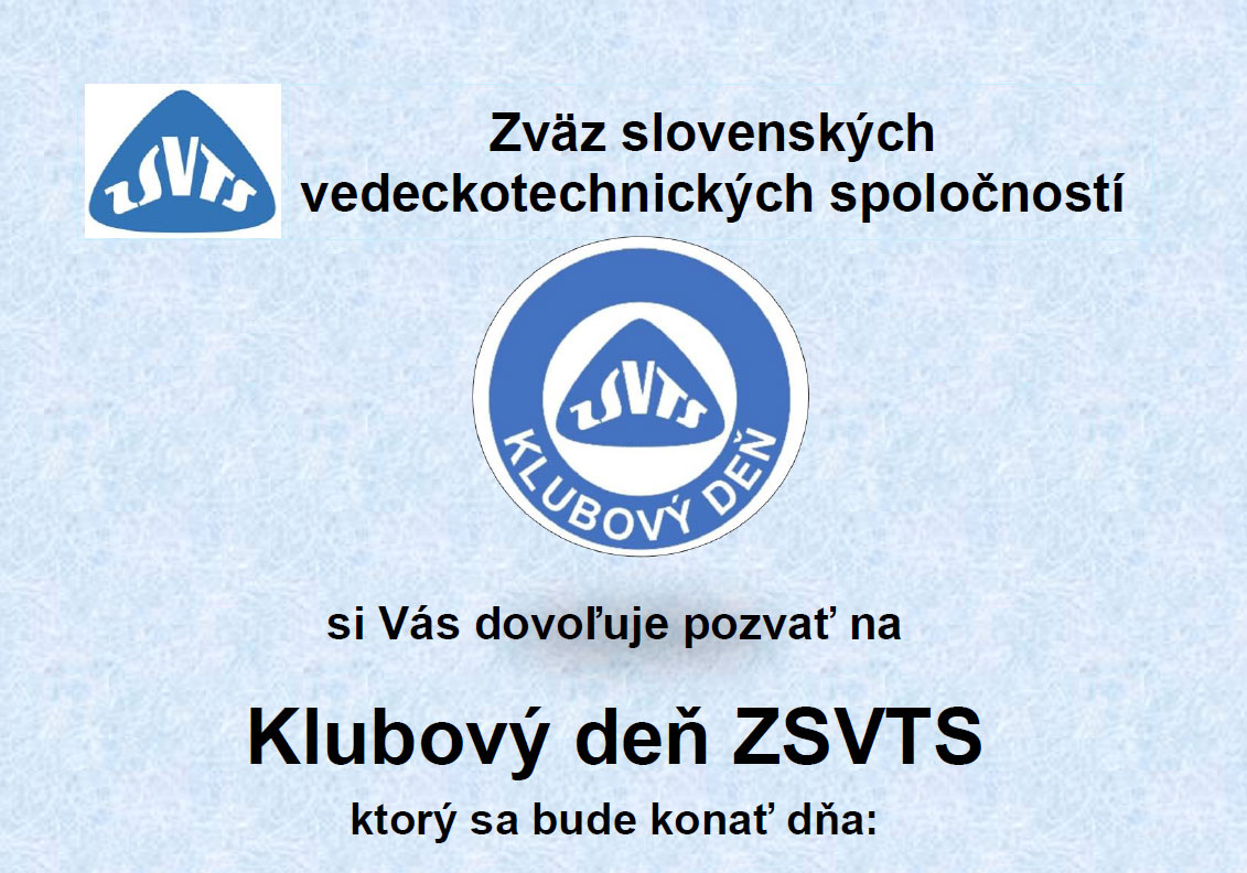 Zväz slovenských vedeckotechnických spoločností si Vás dovoľuje pozvať na Klubový deň ZSVTS ktorý sa bude konať dňa: 21. apríla 2026 (utorok) o 15:00 h na ZSVTS v Bratislave, Koceľova 15