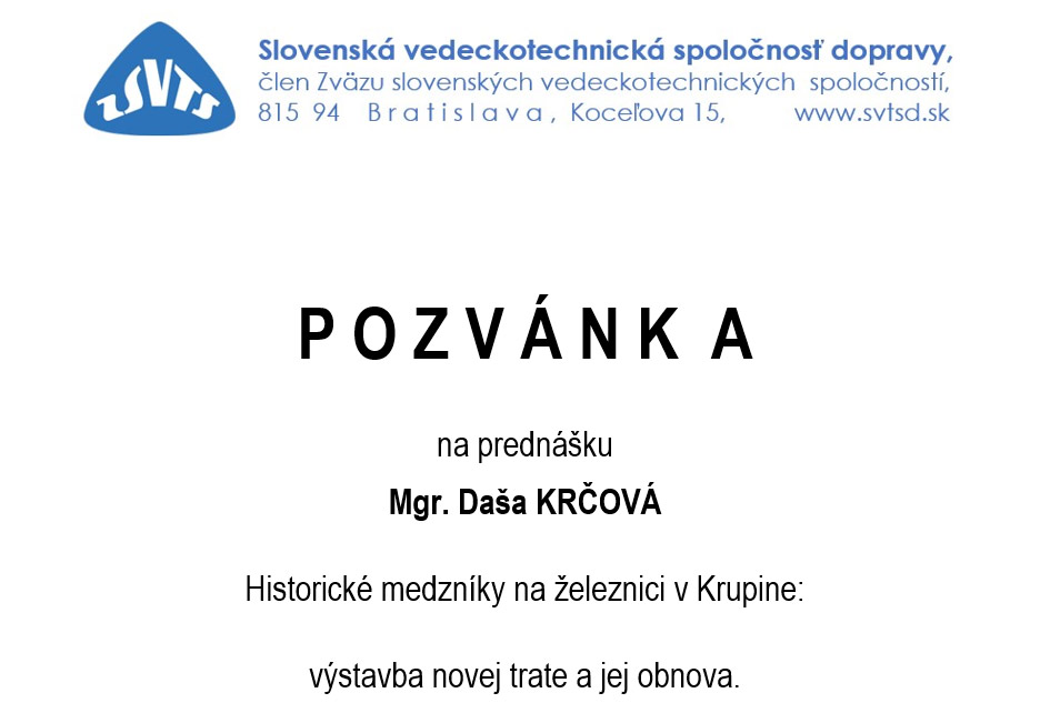 Pozvánka na prednášku Mgr. Daša KRČOVÁ - Historické medzníky na železnici v Krupine - výstavba novej trate a jej obnova. Prednáška sa uskutoční dňa 22. októbra (streda) 2025 o 15:30 h v zasadacej miestnosti GR ŽSR na prízemí, Bratislava, Klemensova 8.