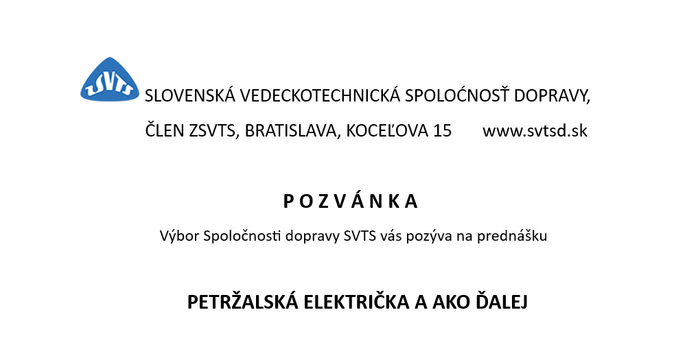Výbor Spoločnosti dopravy SVTS vás pozýva na prednášku Prof. Ing. TIBOR SCHLOSSER, CSc. - PETRŽALSKÁ ELEKTRIČKA A AKO ĎALEJ, Stavebná fakulta STU Bratislava. Prednáška sa uskutoční 26. novembra 2025 (streda)